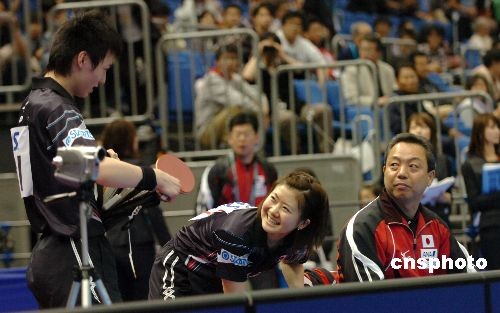 4月29日晚,“瓷娃娃”福原爱与首次搭档的日本乒乓新秀松平健太亮相第五十届世乒赛赛场,并以4:0的比分轻取拉脱维亚混双组合,取得“开门红”。图为赢得比赛后喜笑颜开的福原爱和搭档松平健太交流。中新社发 朱沿华 摄