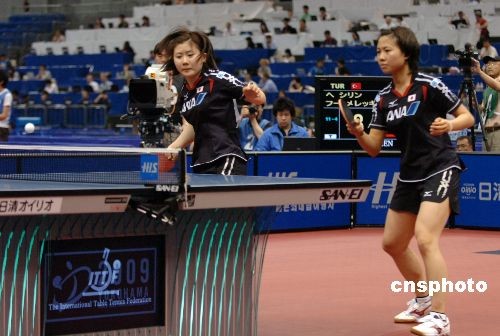 5月1日举行的横滨世乒赛女双第二轮比赛,在女单和混双连遭败绩的日本人气小天后福原爱与队友平野早矢香合作战胜了土耳其的何斯琳/梅莱克,迎来期盼已久的胜利。中新社发 朱沿华 摄
