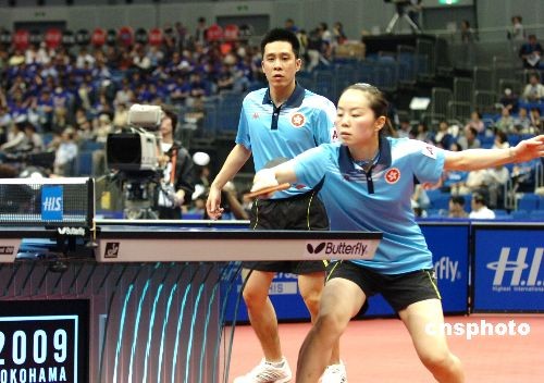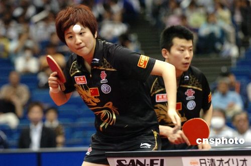 5月2日,在日本横滨进行的第五十届世乒赛混双八进四比赛中,中国的郝帅/常晨晨、张继科/木子、李平/曹臻和张超/姚彦四对组合分别战胜对手进入四强,为中国队提前锁定首金。中新社发 朱沿华 摄