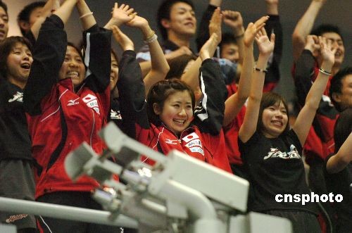 5月3日上午,第五十届世乒赛男双1/4决赛在新横滨体育馆进行。日本水谷隼/岸川圣也组合战胜新加坡对手,杀进四强。在不进行三、四名决赛的赛制下,日本选手已确保一块男双奖牌。这也是日本队在本届世乒赛上获得的首枚奖牌。坐在看台上的日本队其他选手领衔东道主观众为水谷/岸川加油。已经结束全部比赛的“瓷娃娃”福原爱表现得尤为活跃。中新社发 朱沿华 摄