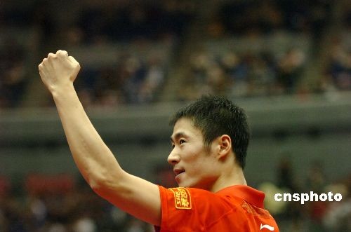 在5月4日傍晚进行的横滨世乒赛男单半决赛中,王励勤以4:3力克队友马琳,杀进决赛。中新社发 朱沿华 摄