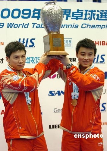 在5月4日晚进行的第五十届世乒赛男双冠亚军决赛中,王皓/陈玘战胜队友马龙/许昕勇夺冠军。中新社发 朱沿华 摄
