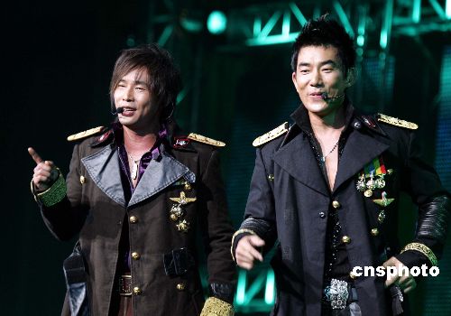 让我们一起为奥运喝彩“美梦齐源”——任贤齐、黄品源演唱会八月十一日晚在北京人民大会堂举行。二位来自台湾的著名歌星倾情演唱了“永不退缩”、“它给我不同的快乐”、“小薇”等人们耳熟能详的经典流行歌曲。中新社发 毛建军 摄