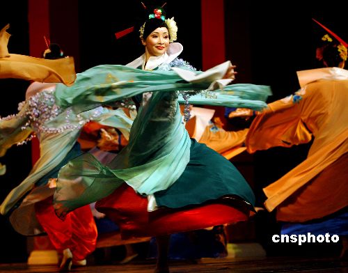 | 八月二十二日晚,一出与经典同名芭蕾舞剧有着天壤之别的中国剧《天鹅湖》在长安大戏院首演。舞剧用中国传统戏曲方式讲述“天鹅湖”的故事,而该剧中国传统戏曲的韵味更淡了,唱腔中融入了京剧、评剧、川剧等众多戏曲元素,还加入了多种样式的中西方舞蹈,华贵的服装也融入了不少西域元素,给观众的感受颇为独特。这是男旦吴汝俊继《贵妃东渡》、《四美图》、《武则天》等剧目后领衔主演的又一部带有探索性的新剧。中新社发 廖攀 摄