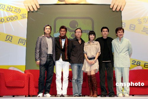 九月二十日,由香港导演陈木胜执导、成龙、古天乐、许冠文等主演的新片《宝贝计划》在北京举行盛大的中国地区首映礼。图为导演陈木胜以及主演成龙、古天乐、徐冠文、高圆圆、陈宝国出席首映礼。中新社发 盛佳鹏 摄