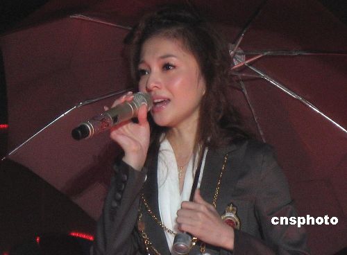 九月二十八日晚,重庆市第三届花卉博览会开幕式大型文艺晚会在重庆奥体中心举行,台湾歌手张韶涵、“超级女生”张靓颖等当红歌手为晚会献唱。图为台湾歌手张韶涵在雨中演唱。中新社发 李慧 摄