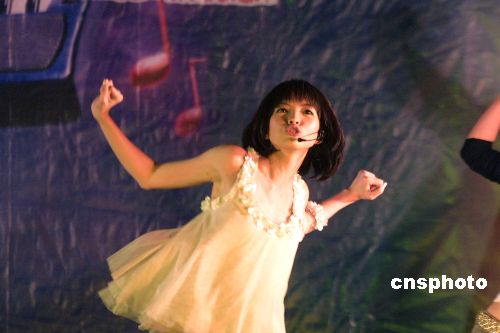 2006年10月30日晚,新加坡歌手郭美美在江苏科技大学校园内举办歌友会,开场一首《不怕不怕》就让热情的粉丝们“疯狂”起来,把演出推向高潮。郭美美还邀请了6名男女同学上台与她一起“踩蟑螂”,和歌友们PK了一把。中新社发 陶春 摄
