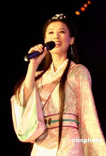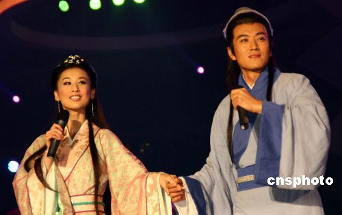 11月10日,黄圣依、杨子在安徽黄山倾情演艺黄梅戏《天仙配》中的唱段“天妻双双把家还”。 当日,中央电视台《同一首歌》大型演唱会首次走进黄山,绯闻情侣黄圣依、杨子大方同台献艺。中新社发 方也广德 摄