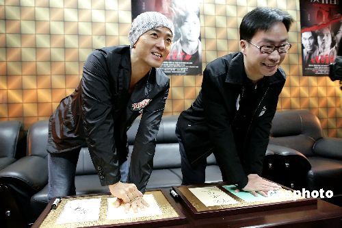 11月12日,香港电影明星郑伊健和导演阮世生到广西南宁万达影城参加《天行者》首映。记者要导演阮世生给郑伊健在《天行者》里的演出打分,导演说:“可以打89分,其实郑伊健在电影里已经演得很好了,只是我这个人比较严格而已。”中新社发 骆文刚 摄