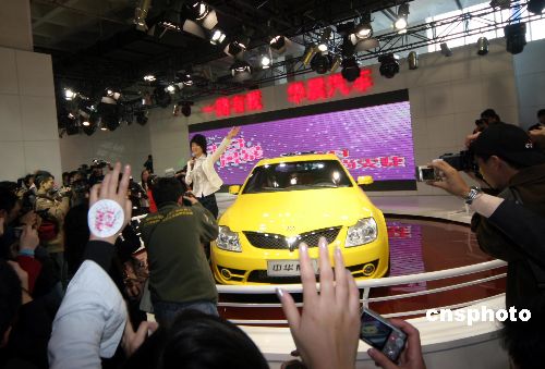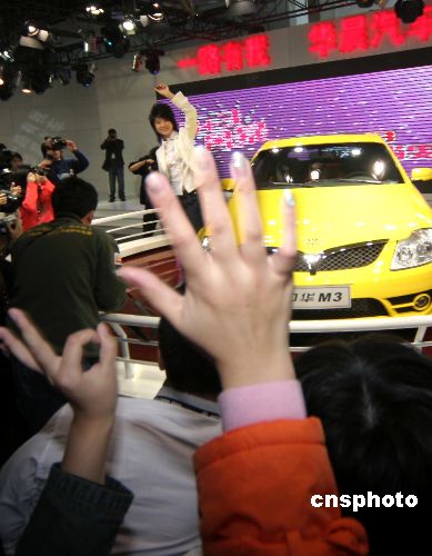 2006年11月21日,2006年度超女总冠军尚雯婕亮相北京国际车展,为即将登场的国内某款运动型轿车加油助威。中新社发 吴芒子 摄