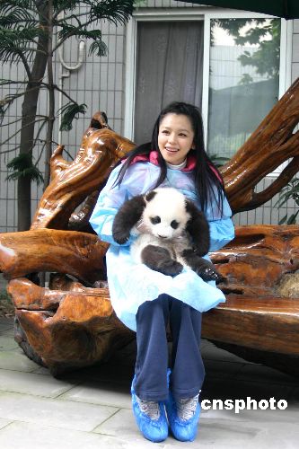 12月10日上午,台湾当红明星徐若瑄到成都大熊猫繁育研究基地,与大熊猫第一次亲密接触,捐资5万元人民币认养2006年8月31日出生的雄性大熊猫“小娇子”,并为之取名为“V王子”。中新社发 杨菲菲 摄