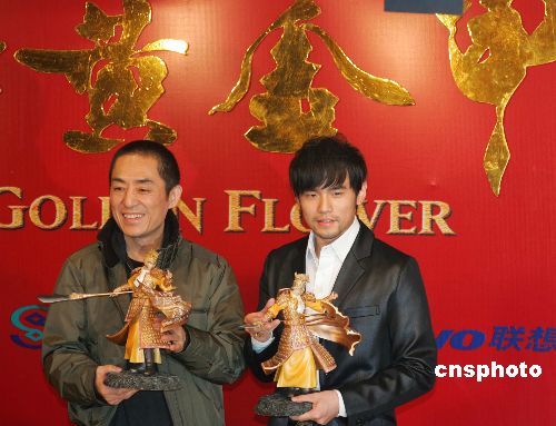十二月二十三日晚,张艺谋、周杰伦等《满城尽带黄金甲》班底在上海举行该影片新闻发布会,图为张艺谋、周杰伦互赠按照他们各自的容貌设计的“黄金甲公仔”。中新社发 潘索菲 摄