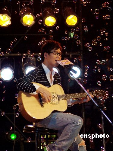 12月26日,品冠福州歌友会在现场歌迷的呐喊声中激情开场,品冠因感冒所以带来吉他自弹自唱,以新专辑第一深情主《爱到无可救药》唱响“品式情歌”,全场合唱有如千人KTV。中新社发 林原 摄