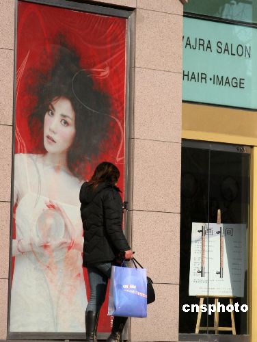 图为王菲与好友那英、御用发型师Elaine等合资,在北京使馆区开设的星级发型屋。这家发屋,门口挂着王菲大海报做招牌,共两层,月租十多万元。由于是明星开店,所以这家店具有极大的明星效应,相应的发型师的收费也是按星级标准来划分,剪发的最低消费是400元人民币,烫发最便宜也要千元人民币。 中新社发 吴芒子 摄