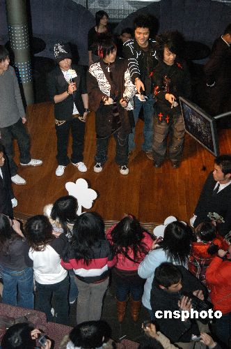 1月13日,花儿乐队在南京麦乐迪KTV举行《麦霸》“万里签红”第二站的全国签售活动,众多“麦霸”迷们赶来为偶像捧场。《麦霸》是花儿继《嘻刷刷》创下KTV热门点唱纪录后的又一力作,麦乐迪更将《麦霸》作为第一支形象歌曲。中新社发 阿董 摄
