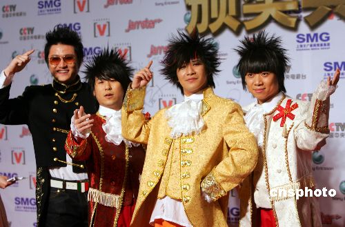 一月二十五日晚,“第十三届全球华语音乐榜中榜”颁奖盛典在上海举行,本次音乐盛典吸引了众多明星前来参加,花儿乐队以一身宫廷装扮出场吸引了众多观众的“眼球”。中新社发 汤彦俊 摄