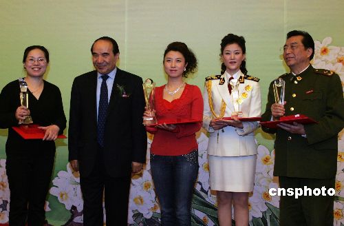 二月十日晚,由中华爱国工程联合会举办的中华爱国人士新春团拜暨爱国群英颁奖典礼在北京全国政协礼堂举行,全国政协副主席阿不来提·阿不都热西提、周铁农、中华爱国工程联合会首席副主席张绪武等和各界爱国人士三百多人欢聚一堂,表彰杰出的爱国人士,喜庆二零零七年新春。图为全国政协副主席阿不来提·阿不都热西提向宋祖英、李双江、刘媛媛等颁发爱国杰出贡献奖。中新社发 武仲林 摄