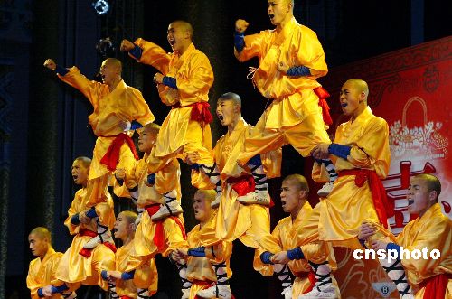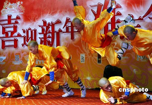 2月15日晚,来自河南嵩山的少林武僧表演团,在北京饭店举行的喜迎新春联欢会上为宾客展示少林功夫,武僧们精彩的表演受到宾客欢迎。中新社发 钱兴强 摄