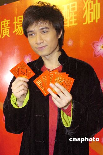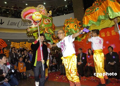 2月22日,香港时代广场为迎接丁亥猪年举行《金龙醒狮贺新岁》庆典活动,香港歌星古巨基担任庆典嘉宾,并亲尝舞动龙珠引领金龙,为活动助庆,他向大家拜年并派发红包。中新社发 邓庆乐 摄