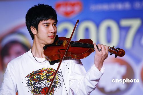 2007年3月7日,“娃哈哈2007思慕王力宏歌迷盛典”在广西体育馆激情上演,可以容纳5000人的场馆座无虚席。歌迷会上,王力宏用小提琴倾情演奏了《朱丽叶》和《kiss me good-bye》二首曲,5000名歌迷一起和唱,全场一片沸腾。中新社发 骆文刚 摄