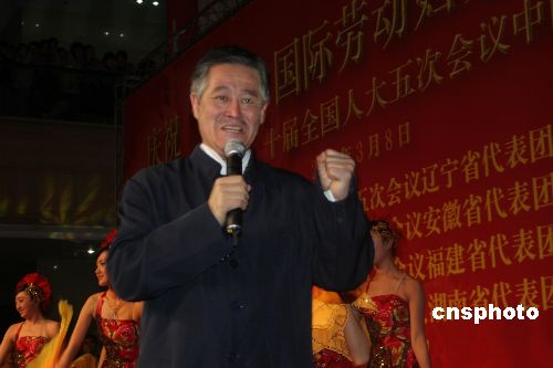 访美归来出席十届人大五次会议的全国人大代表赵本山,三月八日晚在辽宁、湖南、安徽、福建代表团驻地激情献演时高度赞扬海外华侨的爱国心。中新社发 柳俊武 摄