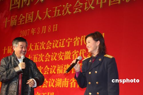 出席全国两会的全国人大代表赵本山与全国政协委员宋祖英等明星,三月八日晚在辽宁、湖南、安徽、福建代表团驻地演唱,与人大代表一道共庆“三·八”妇女节。中新社发 柳俊武 摄