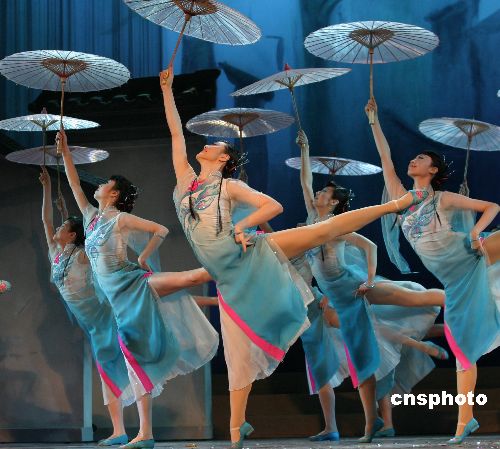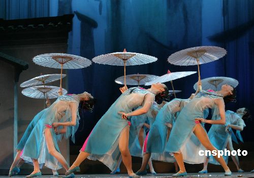 2007年3月18日,由南京军区前线歌舞团创作的舞蹈《小城雨巷》在南京演出,如诗如画的舞台效果令观众陶醉。在今年央视观众最喜爱的春节晚会节目评选中,《小城雨巷》获得歌舞类节目一等奖,受到全国众多观众的好评。中新社发 陈永 摄