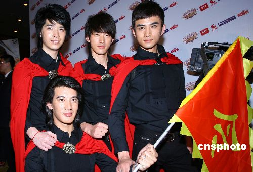 三月二十八日,二零零七年度“美特斯·邦威——加油!好男儿”选秀活动在北京举行赛区启动仪式。去年好男儿三甲得主蒲巴甲(前)、宋晓波(左)、吴建飞(中)和“电眼美男”张晓晨前来助兴。北京赛区开始正式报名、海选,前六强将赴上海参加决选。中新社发 张宇 摄