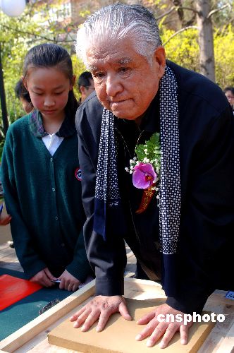 四月十七日,中国话剧主题公园揭幕仪式在北京青年湖公园举行。该主题公园第一期工程包括纪念主题雕塑和纪念林。当日,前来参加揭幕仪式的李默然等话剧表演艺术家在该园认种银杏树,并应邀为公园留下“手模”。二00七年是中国话剧诞辰一百周年,进入四月后系列纪念活动陆续拉开帷幕。中新社发 廖攀 摄
