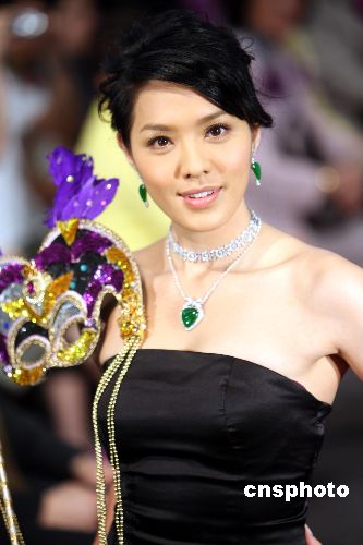 4月25日,香港人气歌手官恩娜在中艺{香港}有限公司举办的“翡致晶莹”珠宝展上演绎美轮美奂的珠宝首饰。官恩娜佩带威尼斯贵族华丽面具,展示价值三千二百二十万元的翡翠珠宝,尽显珠光宝气。中新社发 洪少葵 摄