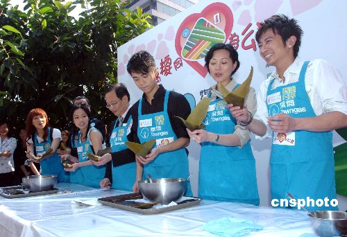5月8日,香港煤气公司与公益金为庆祝香港回归十周年,特别举行《煤气万粽同心为公益》千人裹粽记者会,公布有关详情,香港歌星孙耀威、卫诗、郑融、张敬轩应邀担任活动大使,为活动推广宣传。 中新社发 邓庆乐 摄