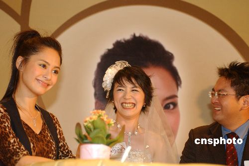 5月19日,香港歌星钟欣桐出席都会广场举行的“十全十美中港台联婚庆典”活动,亲自为她的歌迷、来自台湾的一对新人作任见证。中新社发 蔡蔓莉 摄