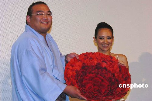 5月28日,在东京举行的中国电影《夜宴》(日本名字《女帝》)日本首映式上,章子怡的粉丝之一、日本著名相扑高手高见盛向心目中的偶像献上玫瑰花篮。中新社发 滕剑峰 摄