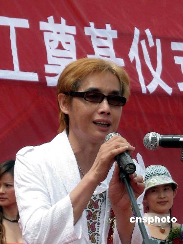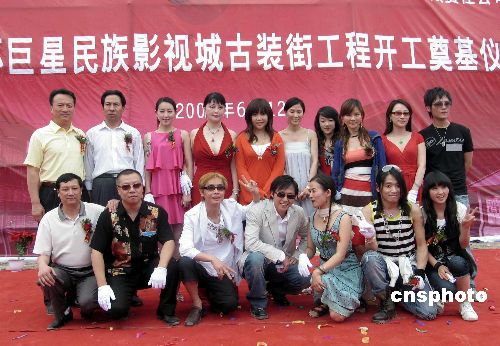 6月12日上午,影视大鳄邓建国携香港著名影星温碧霞、张国强、超级女声纪敏佳、香港演员亚洲小姐宫雪花、梁峥等一行十几人抵达新疆阿克苏,参加阿克苏巨星民族文化影视城古装街工程开工奠基仪式。中新社发 缑烨 摄