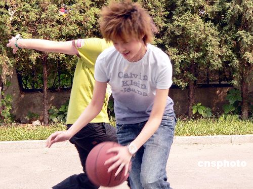 6月15日下午,北京朝阳区惠通时代广场奇虎网门口篮球场,李宇春变身“灌篮高手”拍摄广告,并与一神秘帅哥进行对抗。中新社发 李佳明 摄