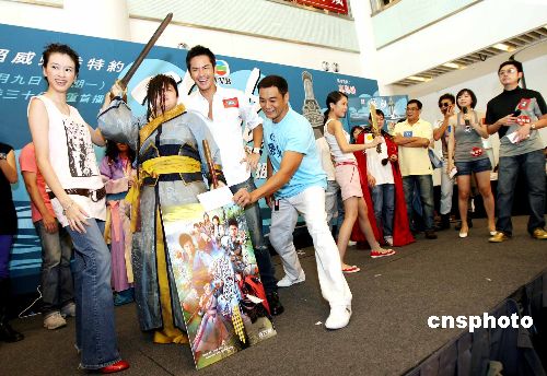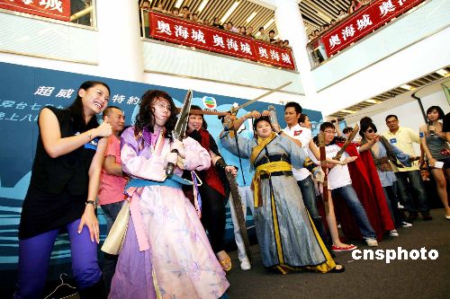 香港无线电视在暑期推出的武侠新剧《强剑》将在7月9日启播。8日,一众剧组主要演员来到奥海城出席宣传活动,现场观众更扮演剧中人物切磋武艺,场面搞笑而热闹。中新社发 洪少葵 摄