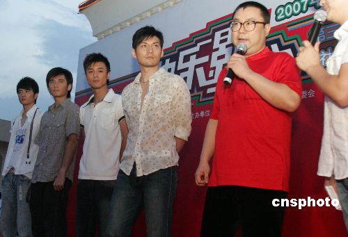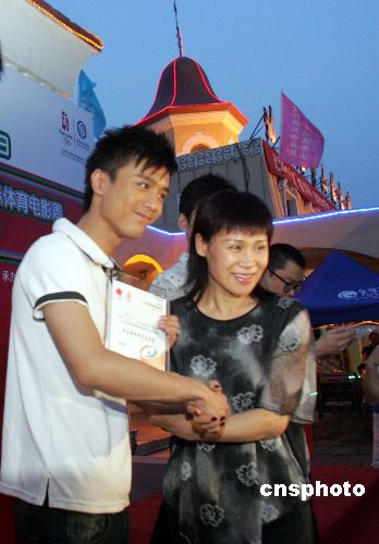 著名演艺、体育界明星尹相杰、叶乔波等,9日晚在石景山游乐园南广场举办的体育电影社区展映仪式上宣传奥运会知识。这届以奥运宣传为主题的第三届北京国际体育电影周活动正在京城展开。中新社发 宋吉河 摄