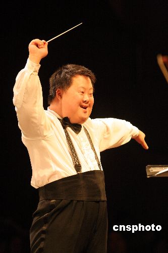 7月23日晚7时30分,由湖北舟舟交响乐团演出的“让世界充满爱”大型交响音乐会在江苏徐州中堂影院举行。2000多名观众欣赏了知名智残音乐指挥家舟舟的现场指挥。中新社发 雍君 摄