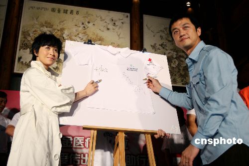 8月4日上午,“嫣然天使基金管委会”主任李亚鹏、委员刘嘉玲、中国红十字基金会秘书长王汝鹏以及由各家医疗机构的骨干医护人员组成的“嫣然天使基金医疗队”在北京举行发布会,宣布“嫣然天使基金医疗队”成立。李亚鹏即将带领医疗队赶赴家乡新疆,举行医疗援助行动的首发式。中新社发 袁方 摄