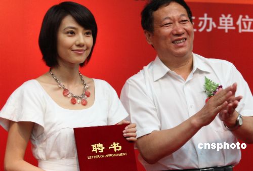 8月18日,北京文学艺术联合会、北京广播电视局、中国电影集团以及怀柔区人民政府联合举行新闻发布会,推出首届中国(怀柔)影视文化节、中国大学生电视文博会论坛、第十五届北京影视春燕奖等文化活动,以“走进怀柔相约影都”为主题,打造走向世界的“中国影都”国家级影视产业集聚区品牌。图为怀柔区委书记王海平向著名影星高圆圆颁发首届中国(怀柔)影视文化节形象大使聘书。中新社发 钱兴强 摄