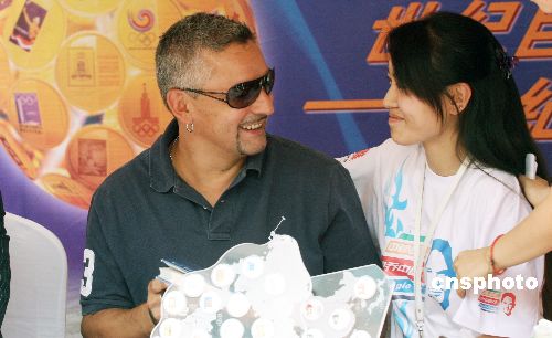 8月31日上午,巴乔在北京王府井百货广场举行2008年奥运特许商品“历届奥运会徽、吉祥物金银大全套”的签售活动,众多球迷到场一睹巨星风采。中新社发 博芽影像 摄