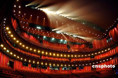 九月十七日,国家大剧院戏剧场灯火通明。当日,北京国家大剧院新闻发言人称剧院首演剧目将在九月二十五日至十月十三日举行试演,在试演期间剧院将邀请剧院建设者和剧院原址搬迁居民观看演出并慰问感谢。中新社发 廖攀 摄