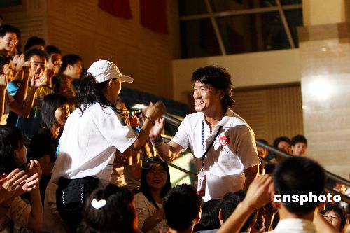 9月17日晚8时,著名歌星周华健为奥运祝福的歌曲《我是明星》的MV在中国人民大学世纪馆进行着紧张的拍摄,百名人大学子积极参与。周华健希望通过自己的努力让更多的人加入志愿者的队伍。中新社发 王利 摄