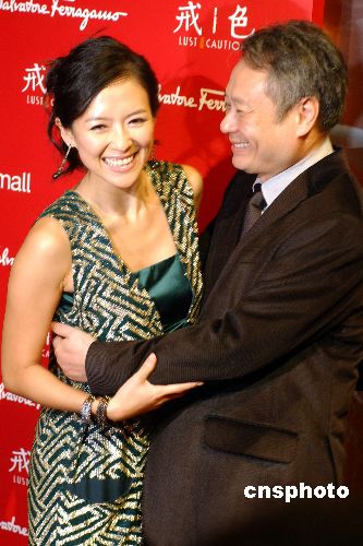 9月22日,《色,戒》在香港举行慈善首映礼,巨星章子怡拥抱导演李安,表示祝贺。中新社发 蔡蔓莉 摄
