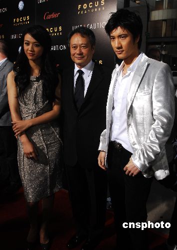 当地时间十月三日,电影《色·戒》导演李安携同女主角汤唯和主要演员王力宏踏上红地毯,出席在洛杉矶比华利美国电影艺术与科学学院举行的美国西海岸献映式。中新社发 贾国荣
