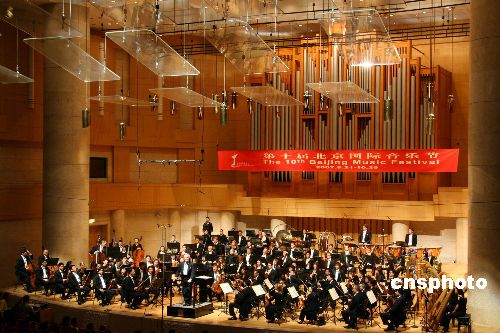 2007年,北京国际音乐节到了第10个年头。同年,香港回归祖国也走过了十个春秋。10月4日,北京国际音乐节纪念香港回归祖国十周年特别专场演出在中山音乐堂举行。来自香港的管弦乐团,为十一长假期间的北京观众上演音乐大餐。中新社发 富田 摄