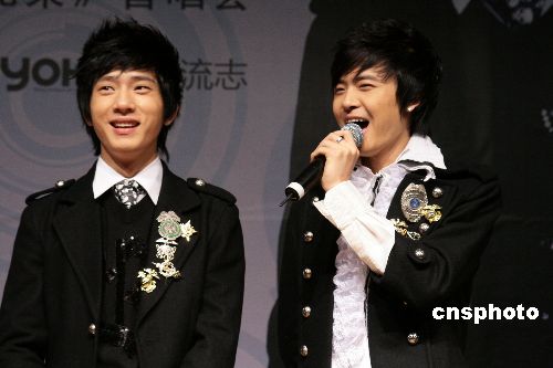 2007年10月22日,由“加油好男儿”的井柏然和付辛博组成的偶像团体BOBO组合在北京举办了他们的首唱会。会上他们不仅载歌载舞与歌迷互动,还收到了大师兄羽泉组合送来的礼物。中新社发 一可 摄