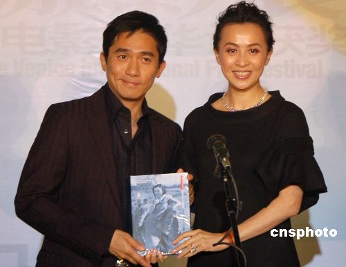10月26日,由于北京大雾航班延误,梁朝伟未能准时出席下午在苏州举行的水城影展——威尼斯电影节华语获奖影片展映日活动,晚上举行记者见面会,刘嘉玲全程陪同梁朝伟并转送威尼斯电影节主席马尔科·默勒尔赠送给他的礼物。中新社发 邱勇 摄