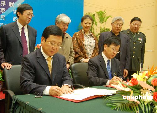 10月27日,由大连市人民政府申办,经中国文联、中国电影家协会考察决定,第17届中国金鸡百花电影节将于2008年9月在大连市举行。图为大连市代表和中国电影家协会代表签约。中新社发 邱勇 摄