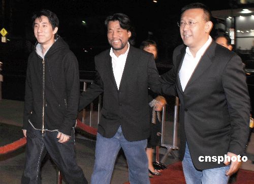 中美电影节十一月一日晚在好莱坞美国导演公会开幕,中国影星及导演姜文(右)和成龙之子房祖名(左)一起走红地毯,出席《太阳照常升起》北美首映式。中新社发 贾国荣 摄